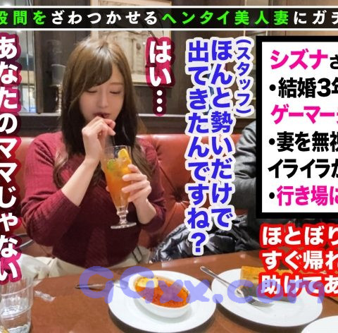 あらすじ:「刺激が欲しい」「ちょいムラ」「なんだかアソコがざわつく」そんな普通の主婦さん達の仮面に隠された性欲を剥き出しにしてあの手この手でヤリまくる何でもあり企画。今回のターゲットは夫と喧嘩した勢いで家を出てしまい傷心中の美人妻シズナさん(28)!東京駅でナンパ中、棚ぼた的に見つけた色白美人!愚痴を聞くという名目でお酒を飲ませ、なしくずし的にワンチャンを狙う男たちの勢いに押され見事に陥落!一旦ガードを崩すと久しぶりの他人棒にノリノリからのイクイク絶頂!!セルフイラマの濃厚奉仕妻×ザーメンタンク空っぽになるほどの濃厚中出し3連発!!!
