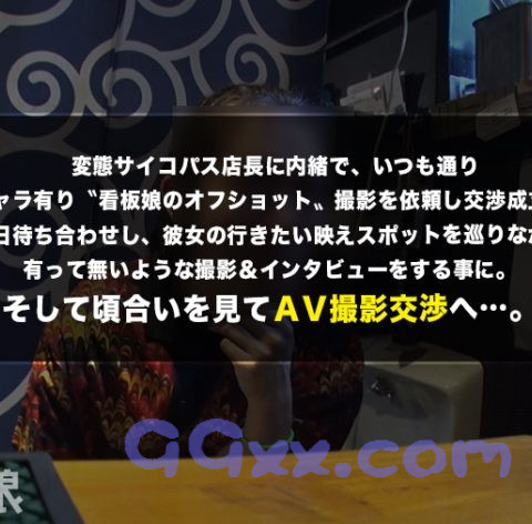 この企画は『全国各地で営業する店』に『取材番組のテイ』で近づき、『店で働く可愛い店員』つまり『看板娘』に交渉。『街で噂の看板娘のAV出演』を目指すドキュメンタリー企画である。①今回取材をするのは東京都渋谷区神泉エリアにある小さなバー。取材番組になりきってターゲットの働くお店に潜入取材を行う!神前駅北口から円山町方面へ歩くこと6分…ラブホテルが並ぶ歓楽街に狭小物件でこじんまりと営業するバー。お好み焼き屋としてオープンをしたものの、立地が立地ということもありラブホに行く前の酒場としか求められていないことに気づきバーに変更をしたという。いい加減そうな店長への取材を行いながら、噂の看板娘が出勤するのを待つ。②店長曰く…「見た目はセクシーなんですけど、内面はフルートとかを習ってるような子で…話してみると育ちが良いんだろうなっていう…」たまたま知り合いの飲み会で出会い、冗談半分で誘ってみたら働くことになったという。今は彼女の都合のいい時に不定期で働いているという。③そんな話をしていると彼女が出勤してきた。名前は「さら」さん。超タイトなニットワンピースで、店長の言っていたとおりセクシーな女性。スカート丈も極端に短い。お客さんに言い寄られて関係を持ったこともしばしば…酒場にこんなセクシーな店員さんがいたらムラムラしてしまいますよね(笑)ワンナイトにも抵抗はなく、経験人数は数え切れないほどだという。見た目通り内面もエロいようだ(笑)彼女曰く、ヤリマンのちょっと下のちょいヤリマンだという(笑)④この噂の看板娘を口説いてAV出演を目指す!ノリは良く、後日の撮影依頼をお願いすると快く引き受けてくれた!数日後、渋谷駅で彼女と待ち合わせをする。行きたいところがあると言われ、彼女の案内で某高層ビルの展望台へ。綺麗な夜景をみて屈託の無い笑顔を見せる彼女。無茶苦茶可愛い。夜景を見た後、豪華な食事をご馳走して本題を打ち出す。和牛、大トロ、ウニ、イクラ…そして分厚い封筒を見せて心を揺さぶれたものの親バレを恐れてNO…この噂の看板娘を口説いてAV出演させることができるのであろうか…つづく。
